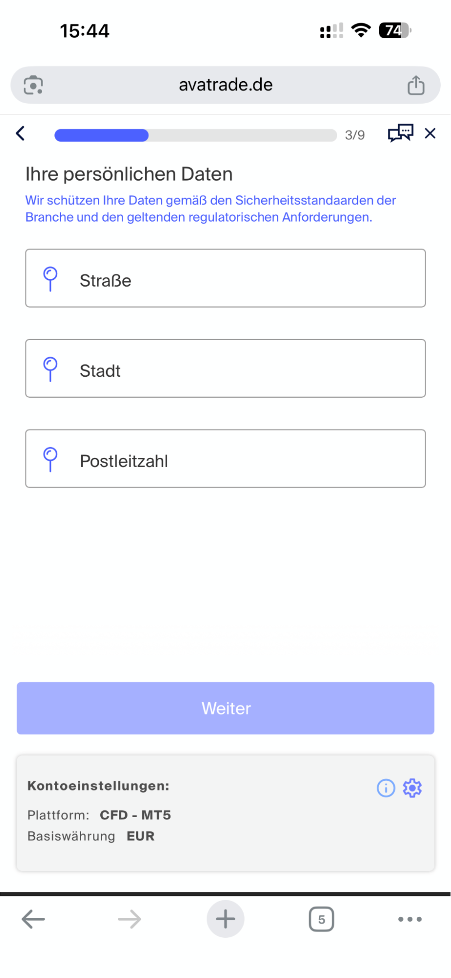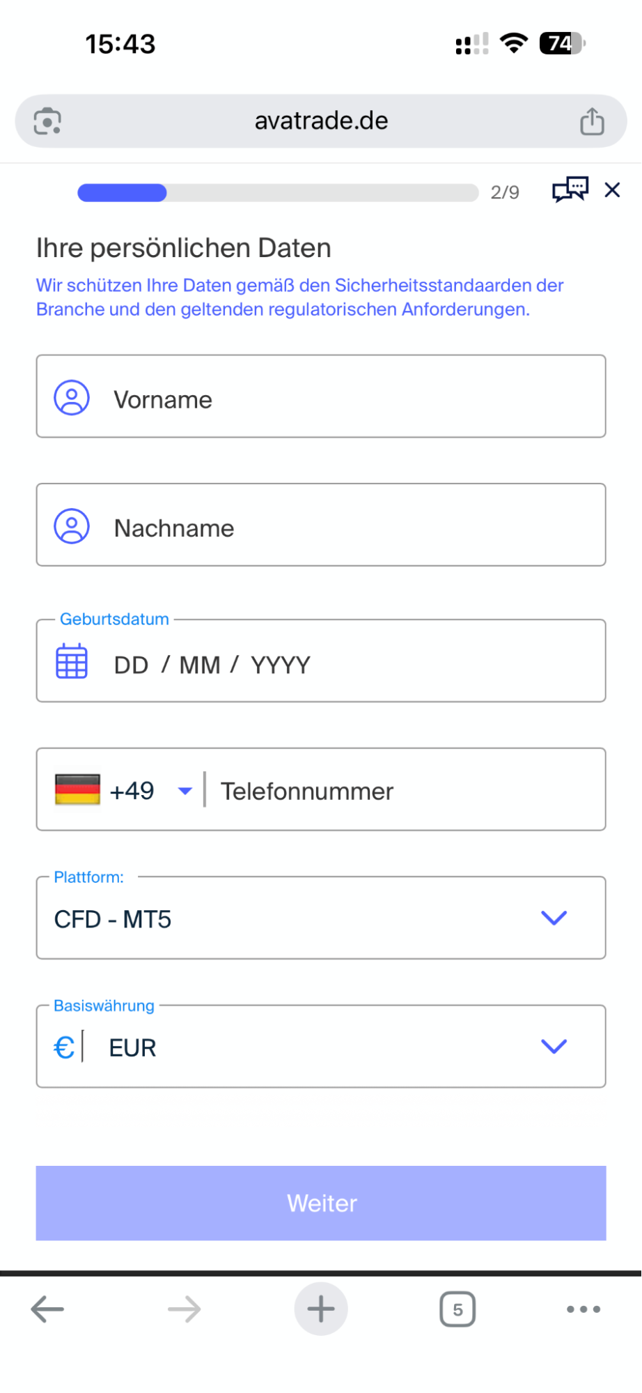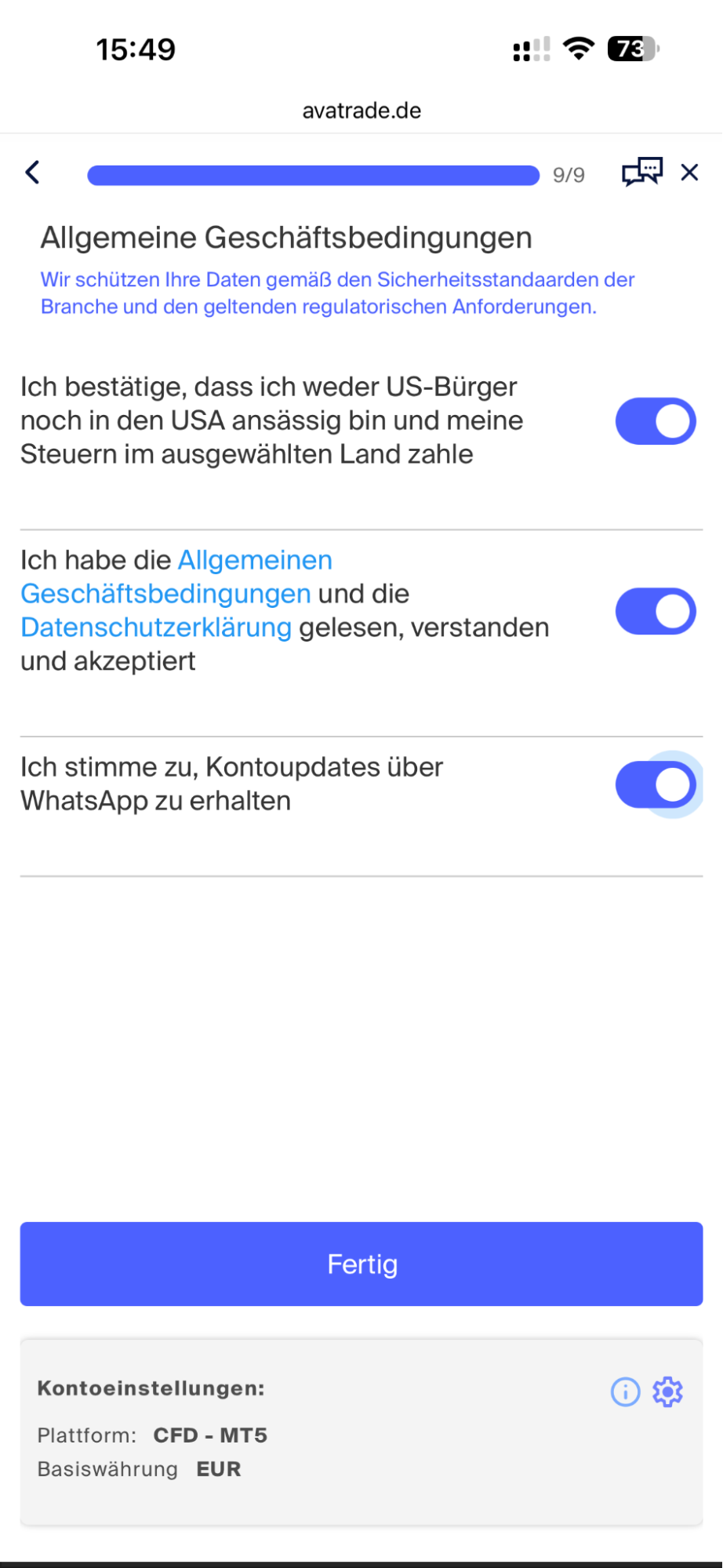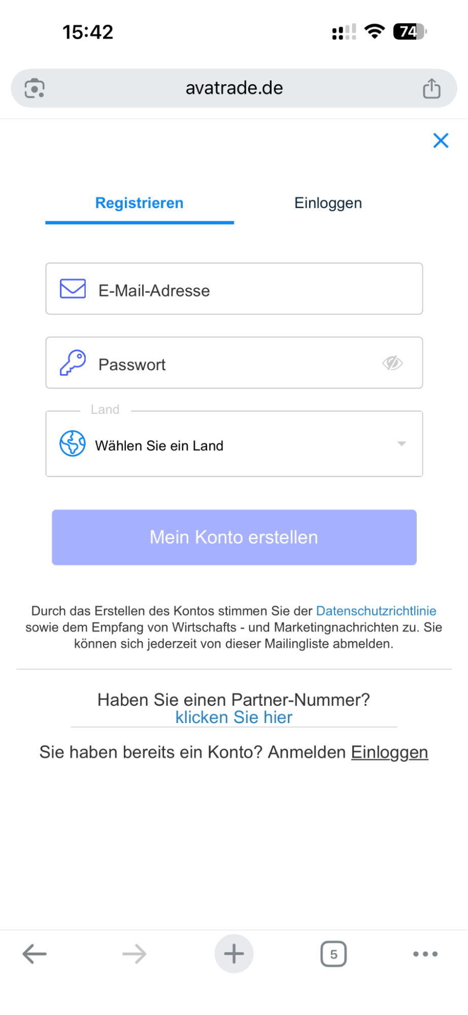 Öffne die AvaTrade-Webseite auf deinem Smartphone oder Desktop und tippe/klicke auf „Jetzt registrieren“.