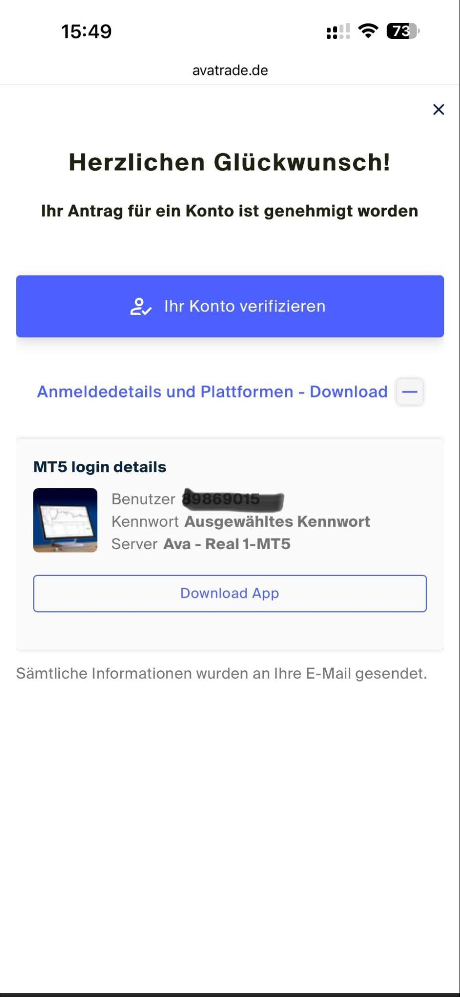 Herzlichen Glückwunsch! Dein Konto wurde genehmigt. Als nächstes: Konto verifizieren und anschließend Geld einzahlen.